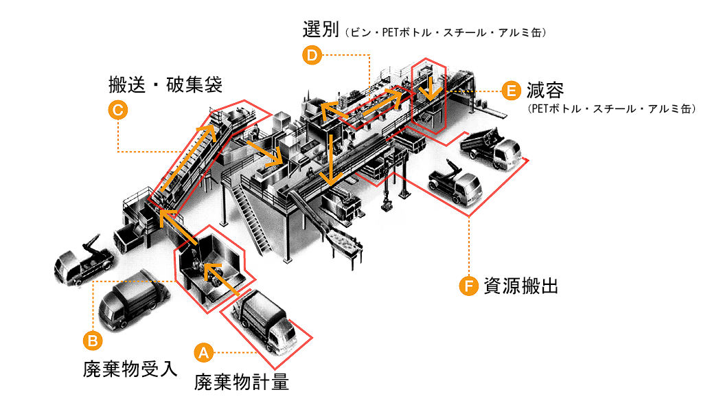 全自動で資源ごみを圧縮減容。多品目を同時に処理可能な圧縮設備やコンパクト設計のPETボトル専用圧縮設備によりリサイクル資源化します。