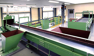 スチール缶・アルミ缶は各選別機により自動選択。PETボトル・びんはコンベア上で手選別します。