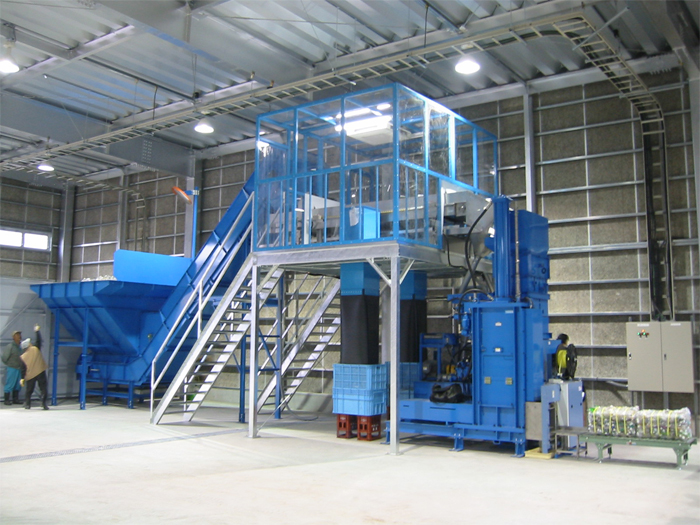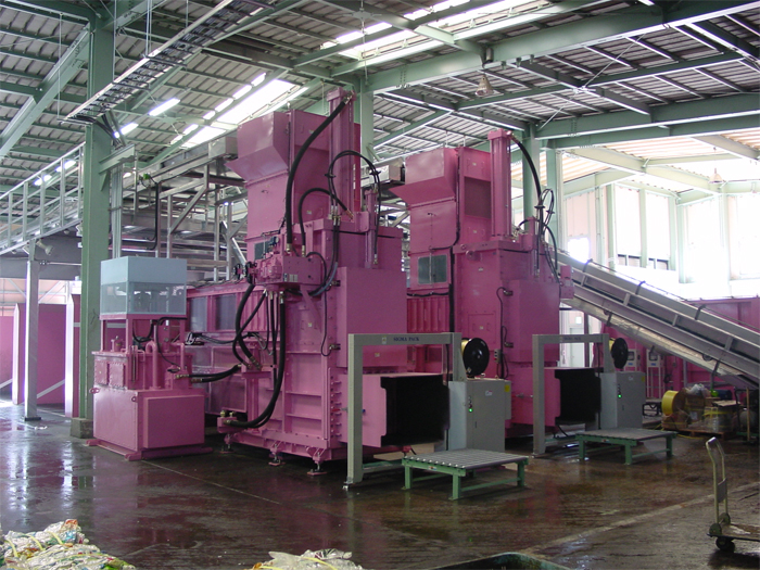 破袋機・選別ラインを有した、大容量処理の資源プラ専用圧縮設備です。