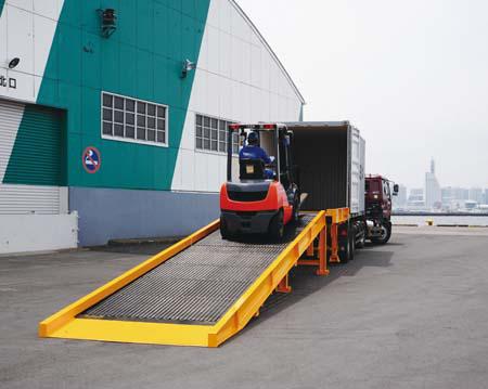 コンテナステージはフォークリフトでの移動可能な簡易型プラットホームです。コンテナステージを設置することによりウィング車を縦に着ける事が出来ます。また使用しない時はネスティングによる段積収納が可能です。スロープと組み合わせることで、フォークリフト作業も自由な乗り降りが出来ます。