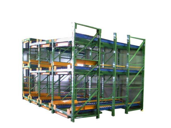 フォークリフトとのコンビネーション、 一歩進んだ商品管理、作業効率の向上を! 動力を一切使わずに格納中の商品移動が行えます! 先入れ先出しの入出庫には是非おすすめです。
