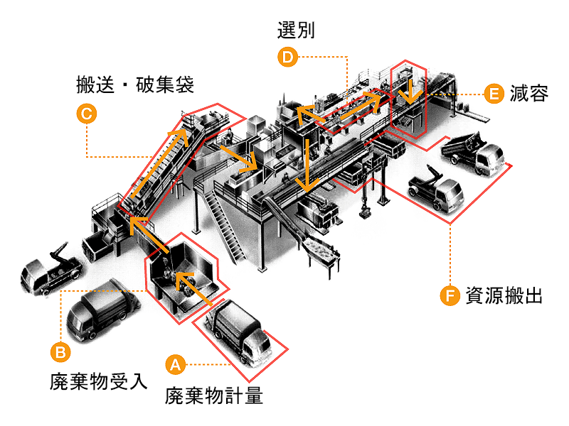 持続可能な循環型社会の構築に欠かせないごみ処理システム。とくに、ごみから資源化へと廃棄物を有効活用できる、処理システムの開発に対するニーズは年々、高まっています。そこで、各メーカーでは高性能な機器の開発が進んでいますが、大事なことはそれらの機器を効率的に組み合わせ、スムーズに稼動するシステムを構築することです。当社は、ニーズに合わせて、最も効率的な分別資源化システムを提案するワンストップサービスを行っております。
