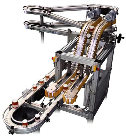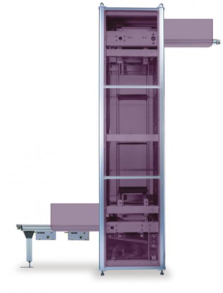 高速化するパッケージング工程に対応した省スペースタイプの 超高速垂直搬送機。小もの品からケース品までスペースセービングに優れた垂直搬送コンベヤ。