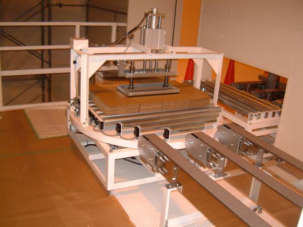 完全製作物。搬送ラインにサイドベルトコンベヤを組み込んだ例。 サイドベルトで挟み込み、搬送するシステム。
