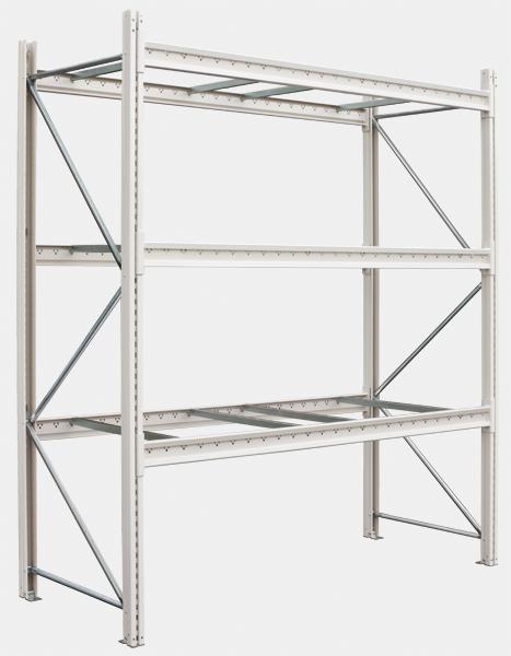 パレットラックは、保管設備の基本と言われるマテハン機器で、パレット単位の重量物をフォークリフトで入庫・保管を行います。平置きや直積み保管と比べ荷繰り作業が不要なため、作業効率が高く、格納物の荷傷みも防止できます。