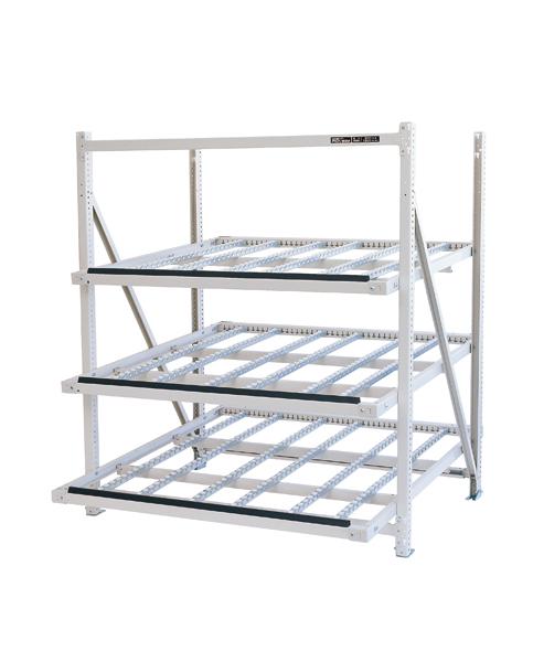 フォークリフトとのコンビネーション、 一歩進んだ商品管理、作業効率の向上を! 動力を一切使わずに格納中の商品移動が行えます! 先入れ先出しの入出庫には是非おすすめです。